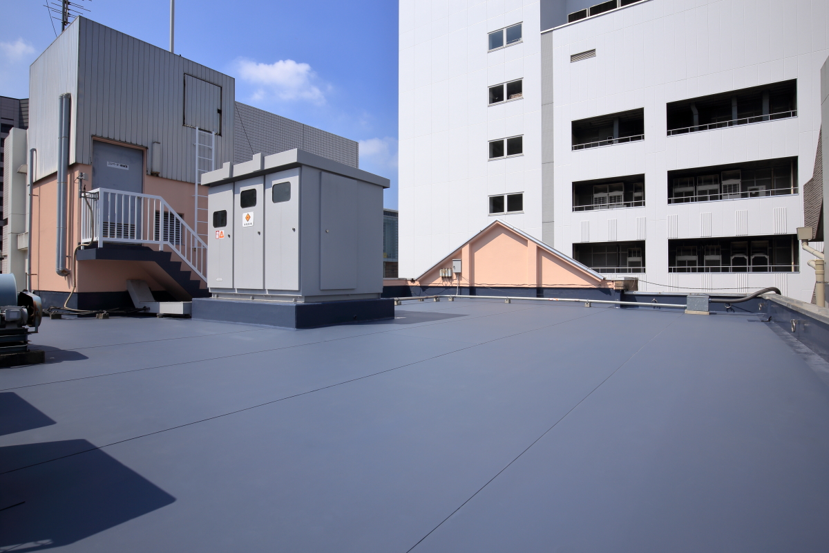 塩化ビニル樹脂系シート防水の機械的固定工法は、下地にドリルで450mm~600mm前後のピッチで穴をあけ、表面加工されたディスクと呼ばれる円盤状のステンレス板やプレート状の固定金具を固定用アンカーを用いて塩ビシートを部分的に固定する工法です。 設備の基礎や側溝など凹凸形状が多い複雑な形状の屋上には不向きですが、既存のアスファルト防水やゴムシート防水などの露出防水層の上から被せて施工できるメリットがあり、多くの改修工事で採用されています。